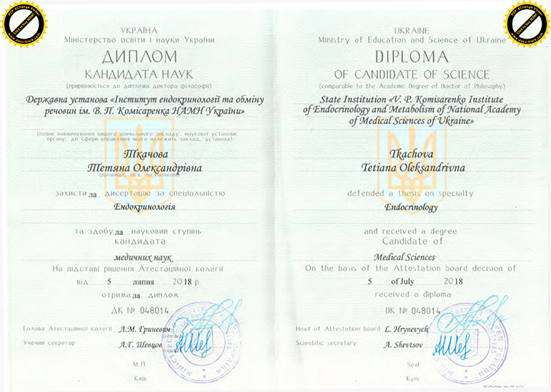 2012-2018 рр. – аспірантура за фахом ендокринологія в НДІ ендокринології та обміну речовин ім. В.П. Комісаренка.