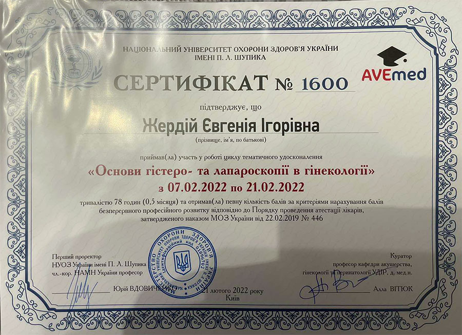 ● лют 2022 - лют 2022 - Лікар акушер-гінеколог. Національний університет охорони здоров’я України імені П Л Шупика, Київ