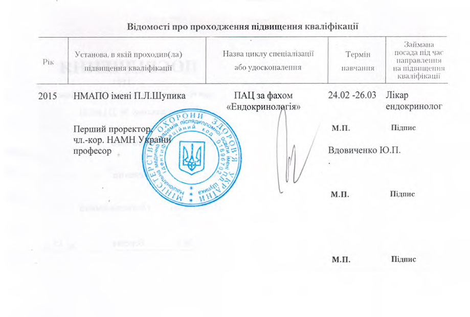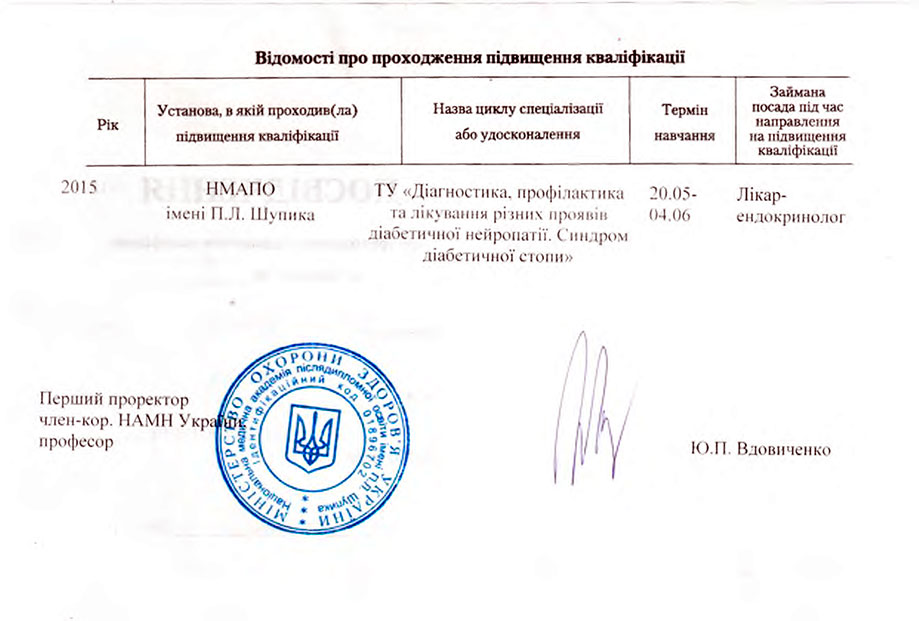 2015 г. – ПАЦ по ендокринології, 2 кваліфікаційна категорія.