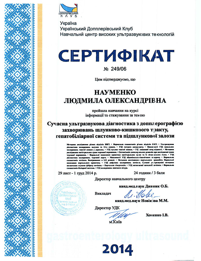 Лікар терапевт вищої категорії та лікар гастроентеролог, який має спеціалізацію і досвід проведення ультразвукової діагностики.