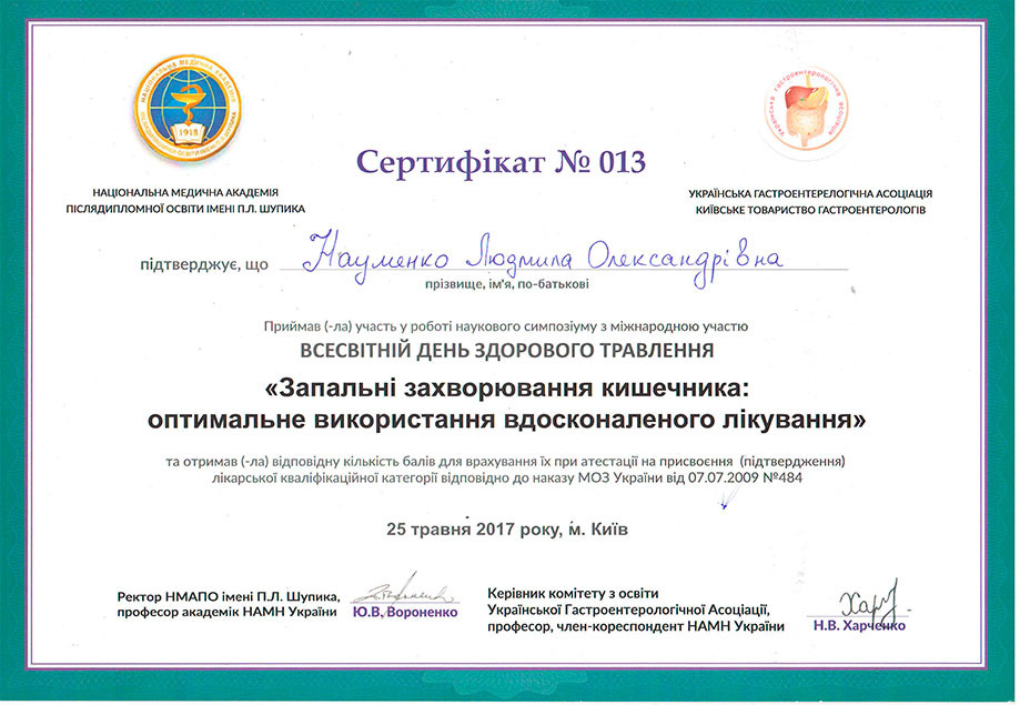 Веде прийом Науменко Людмила ОлександрівнГастроентеролог-терапевт, лікар УЗД
